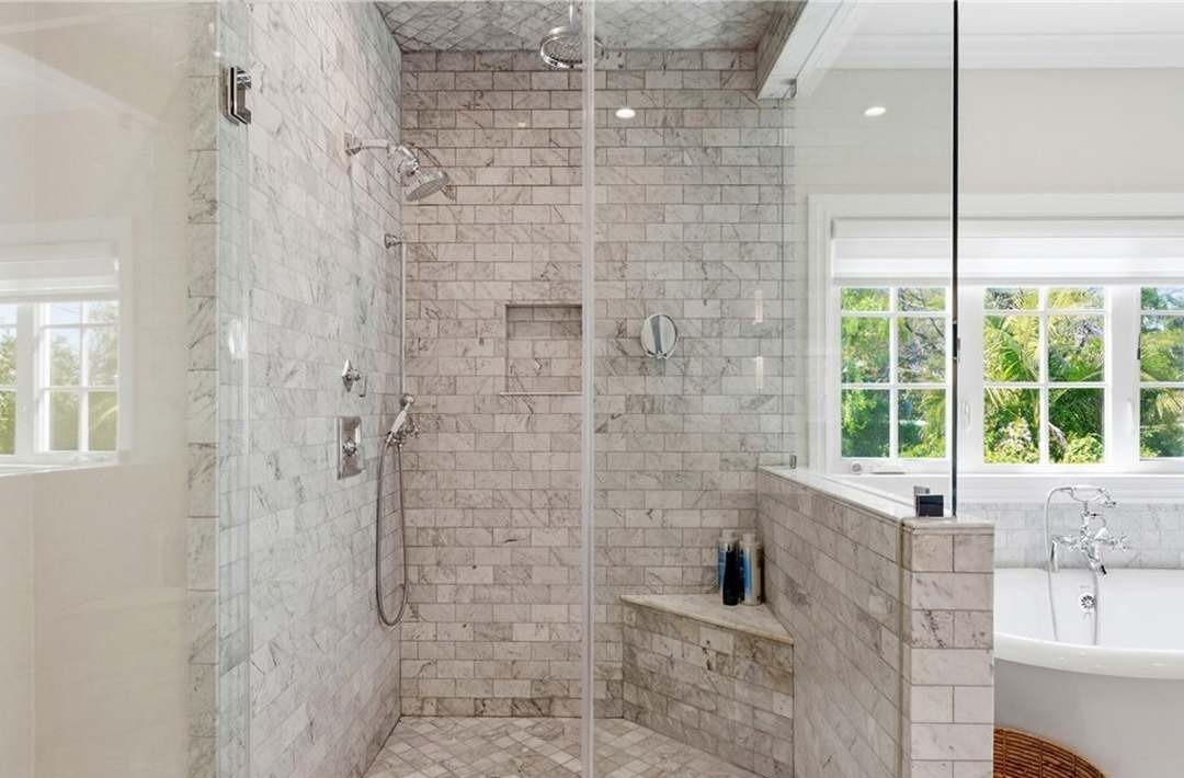 This serene primary bathroom features floor-to-ceiling marble subway tile throughout a spacious walk-in shower with dual shower heads and rain fixture, complemented by a modern freestanding soaking tub positioned beneath large windows. The light-filled space showcases classic white marble with soft gray veining, frameless glass shower enclosure, and chrome fixtures creating a spa-like retreat with timeless elegance.
