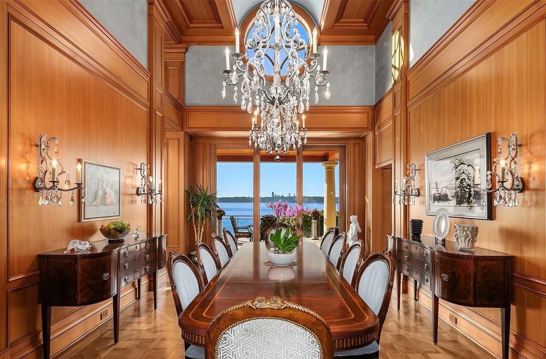 An exceptionally elegant formal dining room featuring richly coffered wooden ceilings, full wood paneling, and an ornate crystal chandelier, anchored by a mahogany dining table with upholstered chairs overlooking expansive waterfront views. The space exemplifies pre-war East Coast luxury with traditional architectural details elevated by museum-quality finishes and contemporary lighting design.