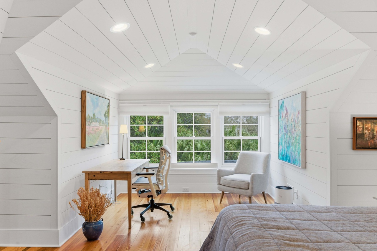 A serene primary bedroom suite featuring crisp white shiplap walls, abundant natural light through large multi-pane windows, and a sophisticated coffered ceiling with recessed lighting. The space seamlessly integrates a dedicated work area with warm hardwood flooring and carefully curated furnishings, balancing comfort with refined elegance.