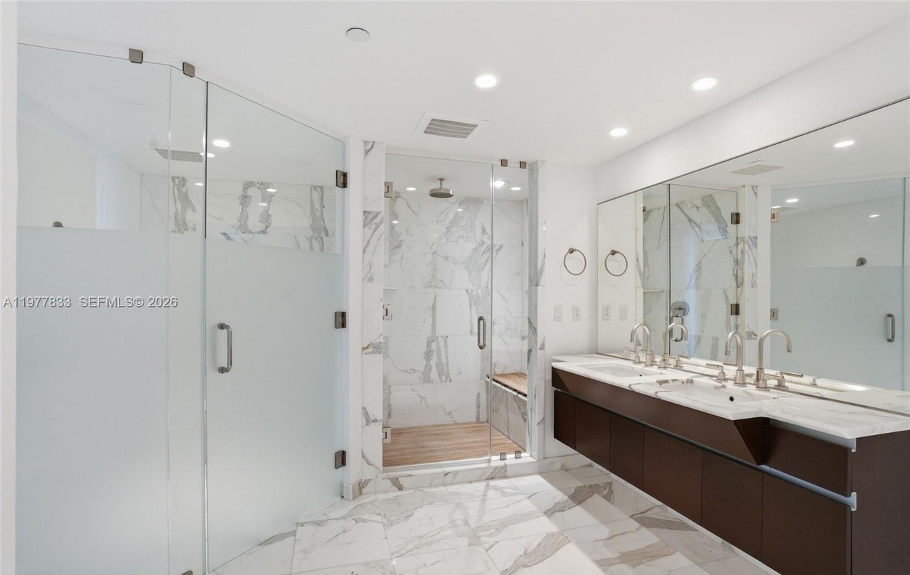 Double VanityFloating VanityWalk In ShowerFrameless Glass ShowerRain HeadRecessed LightingLarge Format TileFloor To Ceiling Marble