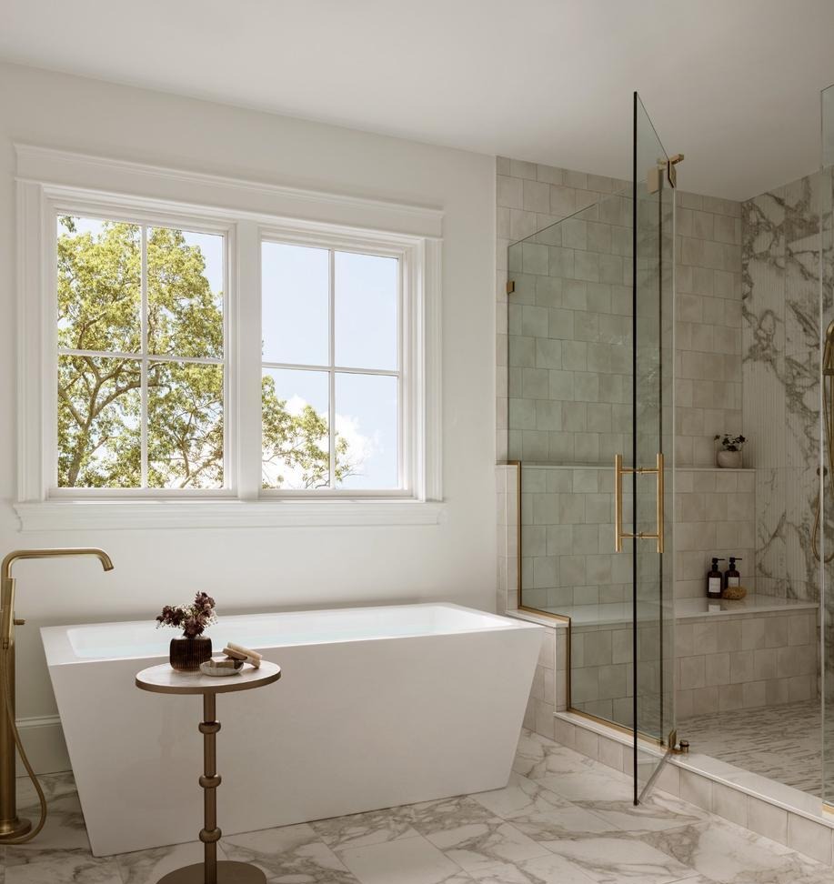 A strikingly serene primary bathroom showcasing a sculptural white freestanding soaking tub positioned to capture abundant natural light from large casement windows, paired with a sleek frameless glass walk-in shower featuring soft green subway tile and polished brass fixtures. The palette of warm cream, soft gray, and white marble flooring creates an elevated spa-like retreat with impeccable material quality and refined transitional design.