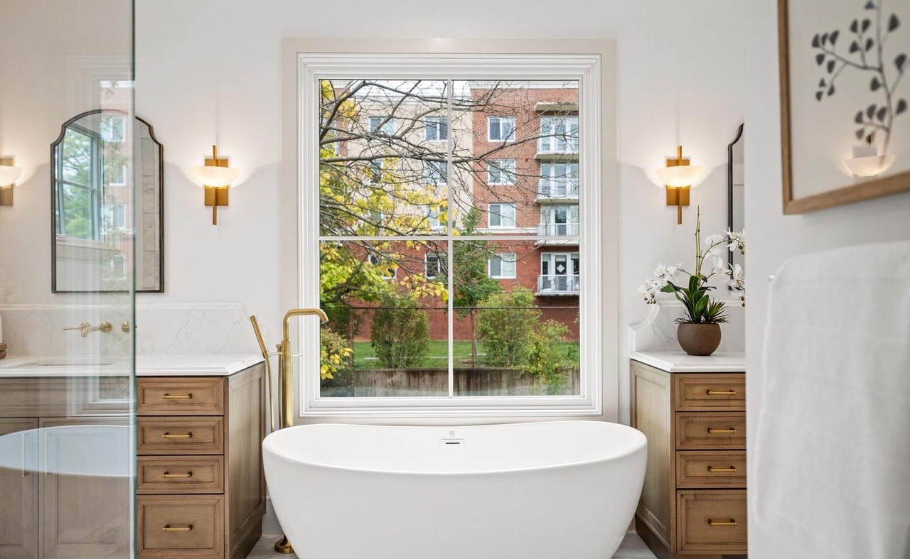 A stunning primary bathroom featuring a sculptural freestanding soaking tub positioned to capture views of an urban brick building through expansive windows, framed by elegant white trim molding. The design seamlessly blends transitional architectural details (crown molding, custom cabinetry) with organic modern warmth through natural light wood furnishings, marble surfaces, and brass-accented sconce lighting, creating a serene spa-like sanctuary with sophisticated editorial-quality finishes.