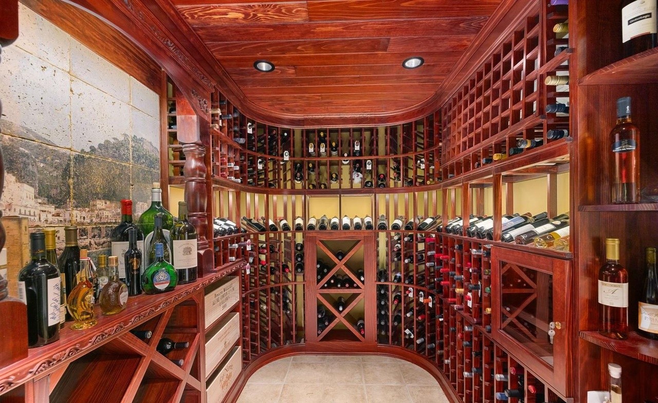 A museum-quality wine cellar featuring custom-built red stained wood storage systems with decorative lattice and X-pattern wine holders, organized across multiple curved tiers with cream-colored interior panels and brass hardware. The barrel-vaulted wood-plank ceiling, warm color palette, and vintage architectural photograph on display create an Old World European ambiance befitting a serious wine collector's private sanctuary.