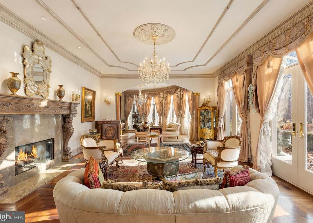 An exceptionally grand and ornate European-inspired living room featuring a stunning coffered ceiling with ornamental medallion, crystal chandelier, and ornately carved marble fireplace. The space is layered with rich traditional furnishings, gilded accents, heavy silk drapery, and collected antique pieces arranged in a formal seating configuration, creating an opulent and sophisticated atmosphere bathed in natural light from expansive windows.