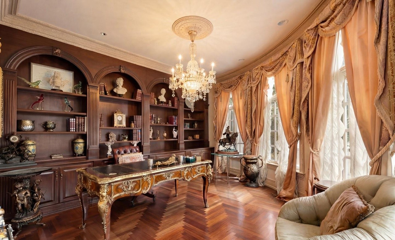 This opulent home office exemplifies old-world European elegance with a dramatic Hollywood Regency aesthetic, featuring richly paneled dark wood cabinetry with brass hardware, an ornamental crystal chandelier, and museum-quality sculptures and busts displayed throughout arched alcoves. Floor-to-ceiling draped windows in warm champagne silk, herringbone hardwood flooring, and meticulously detailed millwork create a collected, curated sanctuary that combines antique refinement with contemporary luxury.