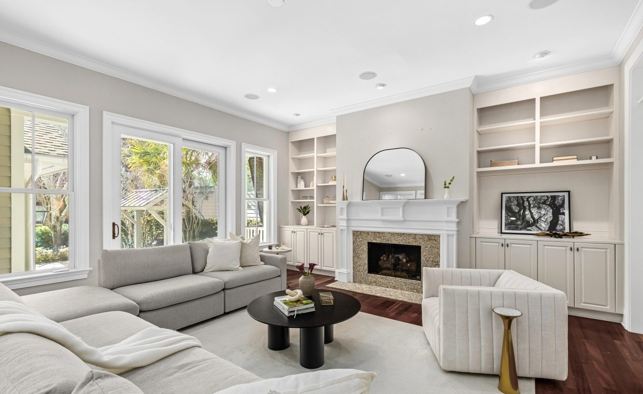 A sophisticated, light-filled living room featuring transitional design with refined custom millwork, a stone fireplace, and contemporary furnishings in soft neutrals. The space balances traditional architectural details like crown molding and built-in shelving with clean-lined, modern furniture and abundant natural light from floor-to-ceiling windows.