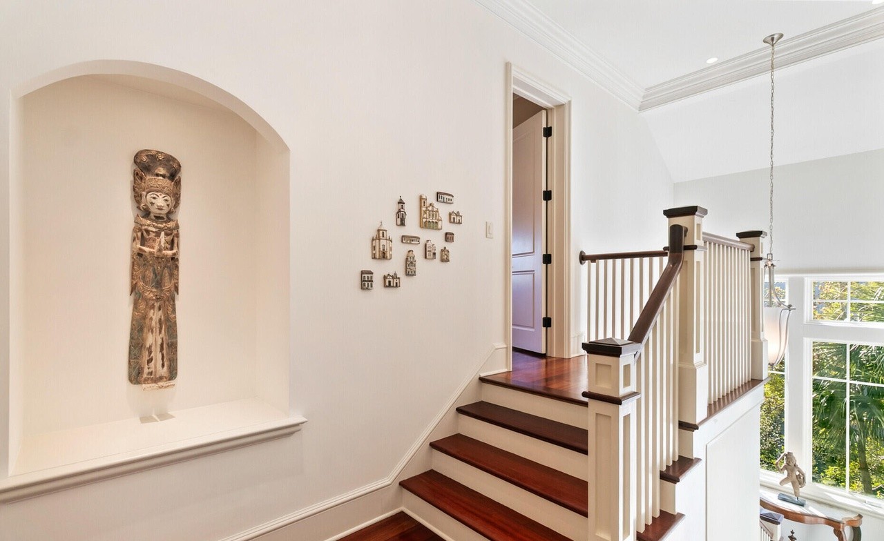 A refined staircase featuring dark hardwood treads with cream and white painted railings, accented by a coffered ceiling with crown molding and an elegant arched niche displaying a carved wooden figure. The space exemplifies transitional luxury design with traditional architectural details and contemporary clean finishes, bathed in abundant natural light from floor-to-ceiling windows.