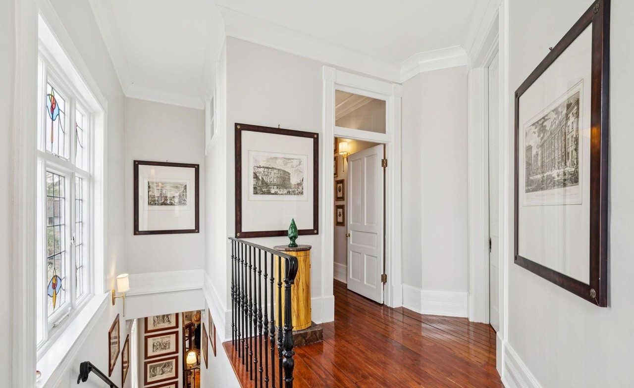 An elegant pre-war hallway exemplifying refined transitional design with crisp white walls, dark wood-framed architectural prints, and ornate dark iron stair railings complemented by warm hardwood flooring. The space features abundant natural light from leaded-glass windows, sophisticated crown molding, and carefully curated artwork, creating a gallery-like passage that balances classical architectural details with contemporary restraint.