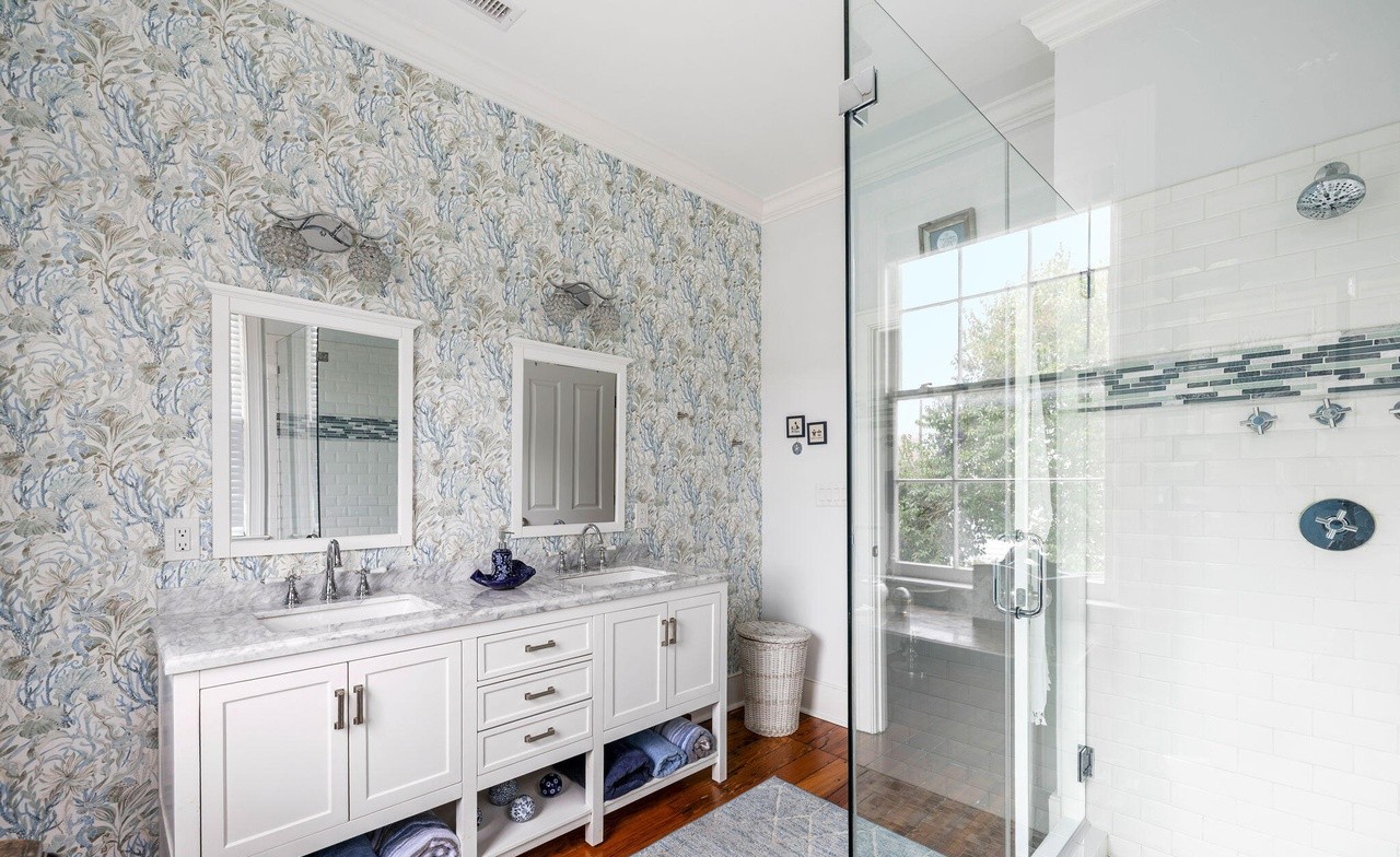 A sophisticated primary bathroom featuring a dual-vanity marble countertop, crisp white cabinetry, and an elegant blue-gray botanical wallpaper that elevates the space beyond standard design. The abundant natural light, frameless glass shower enclosure with subway tile surround, and classic chrome fixtures create a serene, polished aesthetic that balances traditional elegance with contemporary luxury.