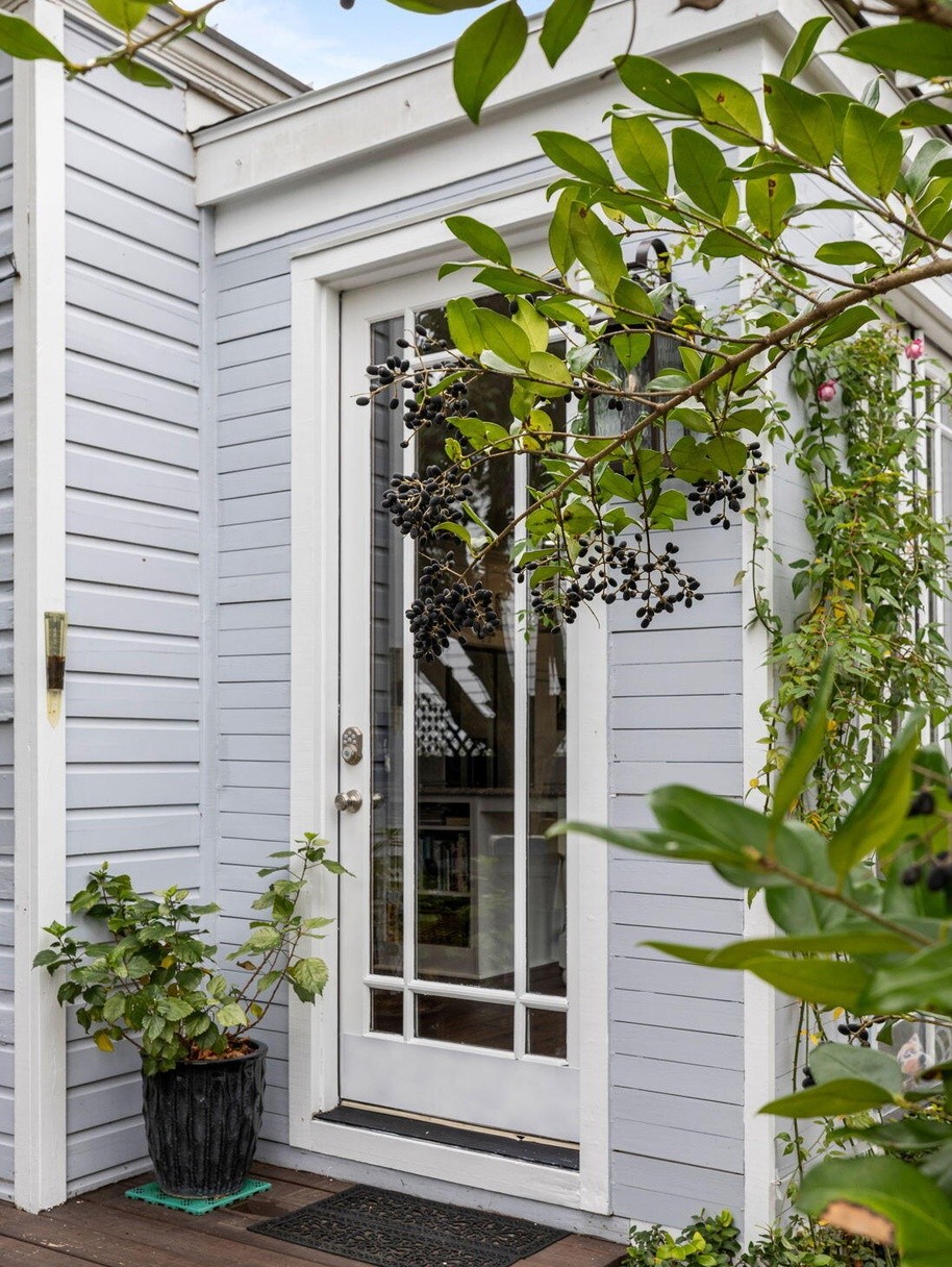 A sophisticated modern entryway featuring clean white horizontal shiplap walls, abundant natural light from a large skylight and floor-to-ceiling glazed door, and lush living vines and potted plants creating a serene botanical atmosphere. The space exemplifies contemporary coastal design with its minimalist palette, natural materials, and seamless indoor-outdoor connection.