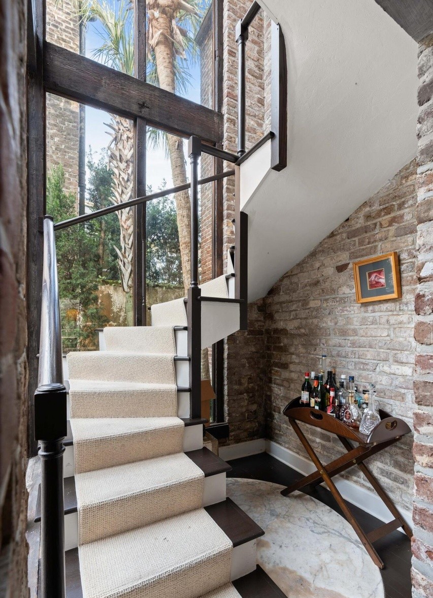 A striking industrial-transitional staircase featuring exposed brick walls, white linen-wrapped treads with black risers, and sleek black metal railings. Large floor-to-ceiling steel-framed windows flood the space with natural light, framing views of mature palm trees and creating a dramatic interplay of scale and modern luxury within a converted historic building.