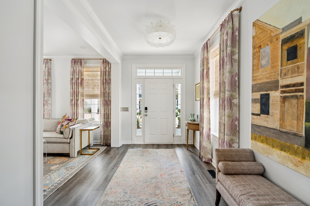 A sophisticated entry foyer with classical proportions enhanced by contemporary finishes, featuring abundant natural light from full-height windows, elegant floral drapery in mauve tones, and refined furnishings including a custom window seat and carefully curated artwork. The space balances traditional architectural details like crown molding with clean modern aesthetics and warm neutral tones, creating an inviting yet elevated first impression.
