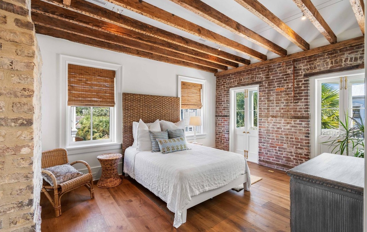 A stunning coastal-transitional primary bedroom featuring exposed wooden beams, original brick walls, and abundant natural light from oversized windows and French doors opening to outdoor space. The room masterfully blends rustic architectural elements with refined furnishings, natural fibers, and a serene white-and-cream palette accented with warm wood tones and soft blue details.