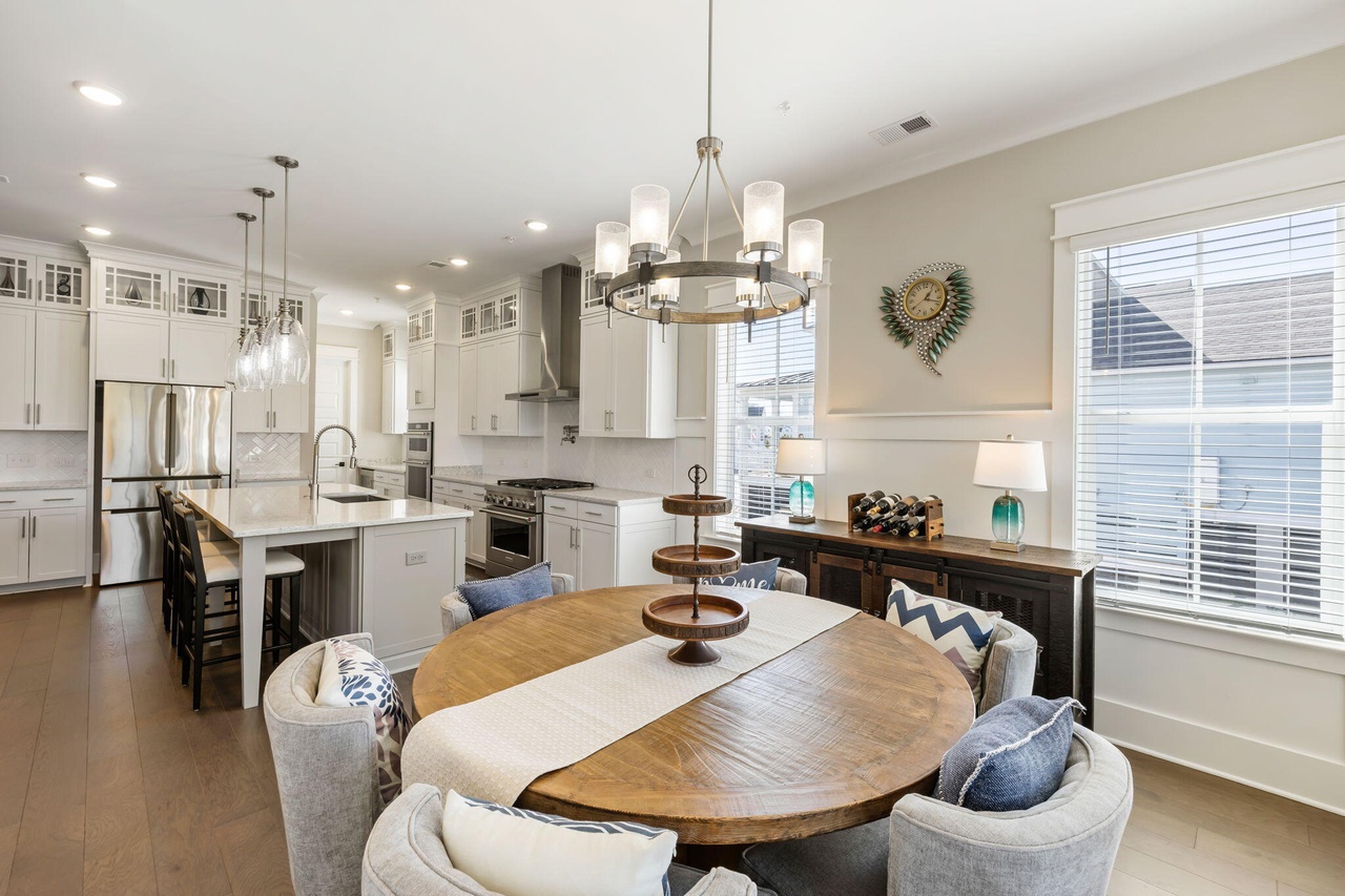 This sophisticated open-concept kitchen and dining space seamlessly blends transitional design with organic modern warmth through white cabinetry, natural walnut furnishings, and abundant natural light. The thoughtfully curated space features a waterfall quartz island, statement chandelier, and layered lighting that creates both function and elegance while maintaining an inviting, lived-in luxury aesthetic.