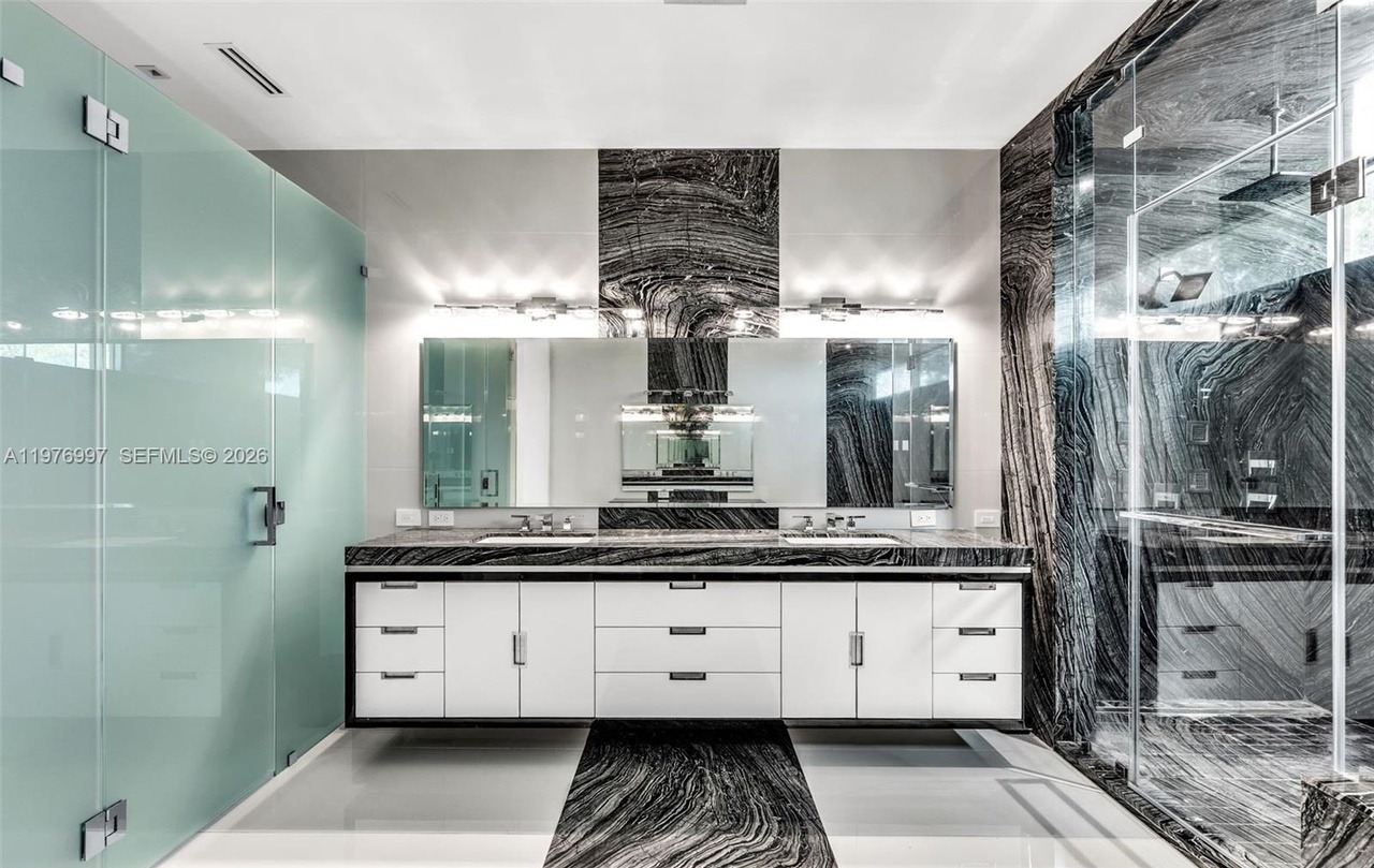 Countertop: MarbleCabinets: Flat PanelCabinet Color: WhiteFlooring: MarbleBacksplash: Stone SlabCeiling: StandardVanity: Marble TopShower: Frameless GlassTile: Large Format