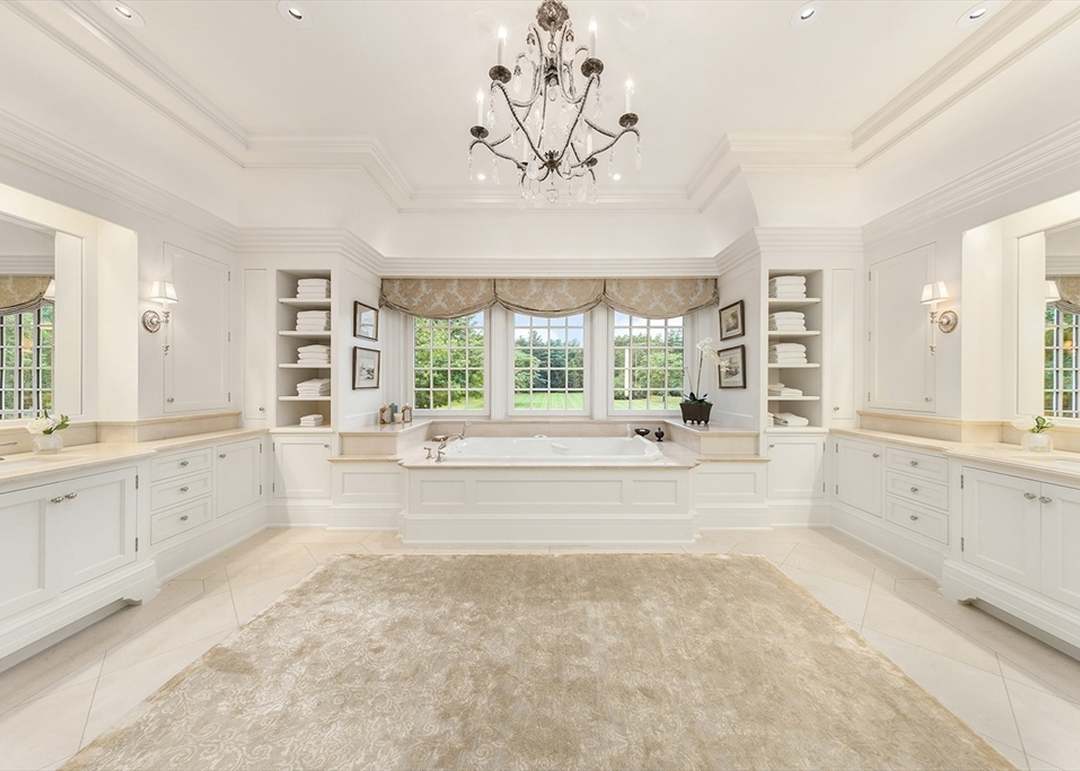 Double VanityBuilt In ShelvingCoffered CeilingCrown MoldingFreestanding TubFloor To Ceiling WindowsStatement LightingCustom MillworkHigh CeilingsWainscoting