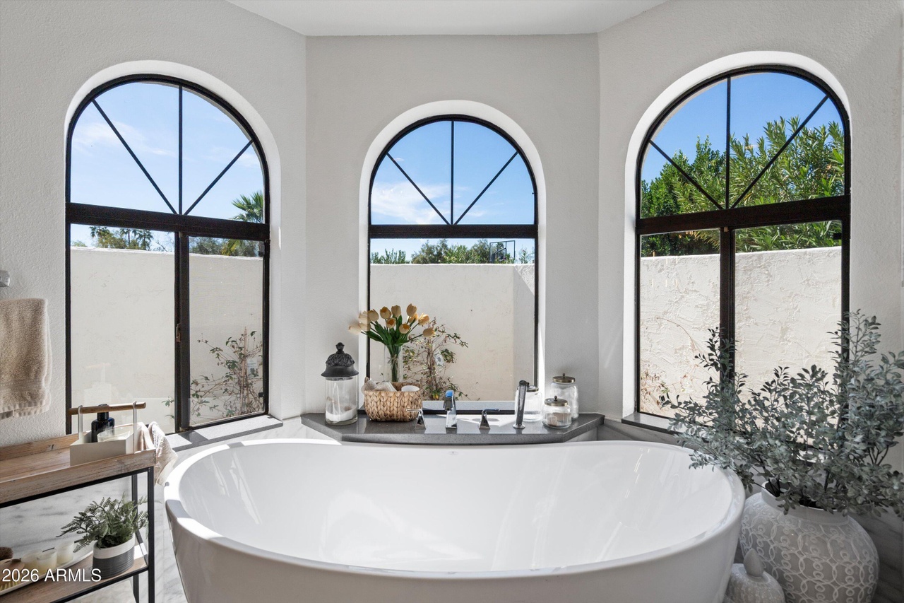 A breathtaking primary bathroom featuring a sculptural freestanding tub positioned beneath three soaring arched windows with black metal frames, flooding the serene white space with abundant natural light. The design masterfully blends organic modern sensibilities with transitional elegance through the pairing of concrete countertops, polished marble flooring, floating vanity, and carefully curated potted plants, creating an editorial-quality spa-like retreat.