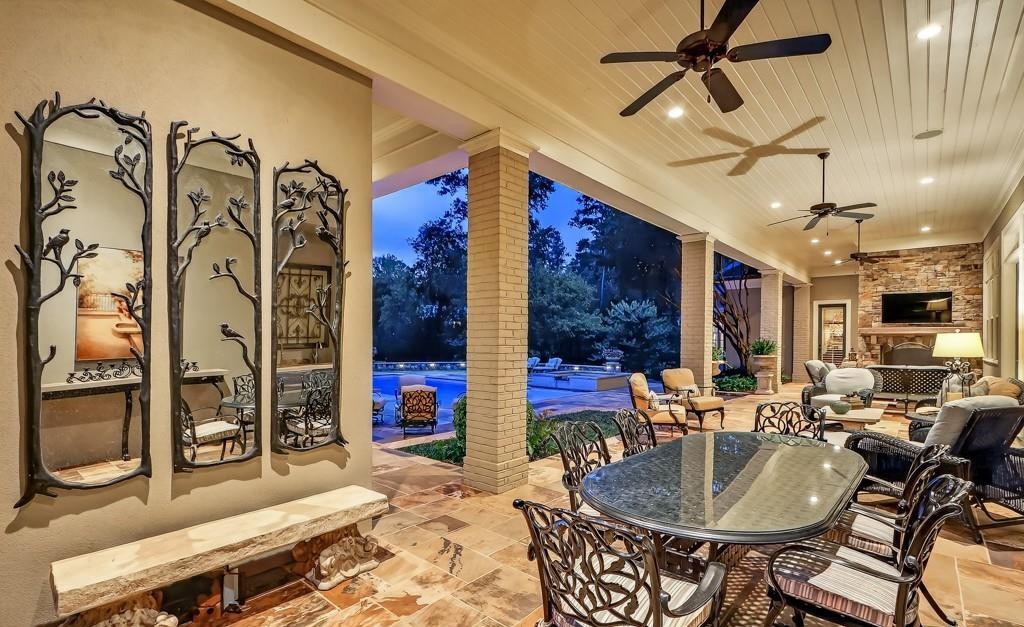 A spectacular covered patio combining transitional elegance with organic modern warmth, featuring floor-to-ceiling glass walls overlooking an illuminated pool, wrought iron furnishings, decorative metal panel wall art, and a wood-plank ceiling with integrated lighting and ceiling fans. The space seamlessly blends indoor comfort with outdoor living through premium stone finishes, bronze accents, and careful attention to material pairings, creating a resort-style entertaining environment.