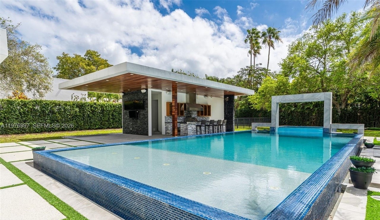 PoolOutdoor KitchenInfinity EdgeRaised PoolCovered PavilionBar SeatingPalm TreesCustom MillworkStatement LightingOpen Concept