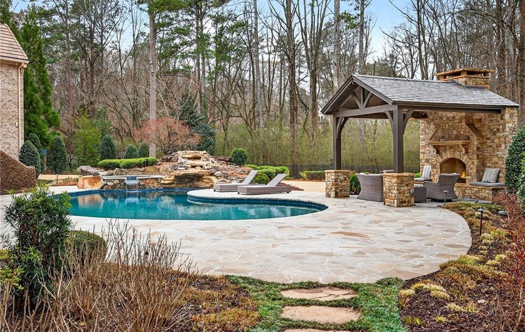 An exceptionally sophisticated poolside resort-style oasis featuring a kidney-shaped pool with integrated fire pit seating, anchored by a substantial brick outdoor fireplace with covered pergola structure. The design masterfully blends organic materials—aged stone pavers, natural brick, and timber—with modern furnishings and landscaping to create an elevated yet approachable luxury escape.
