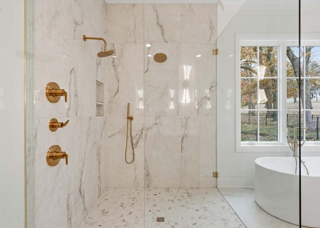 Freestanding TubWalk In ShowerFrameless Glass EnclosureFloor To Ceiling WindowsMultiple Shower HeadsRecessed LightingLarge Format Marble Tile