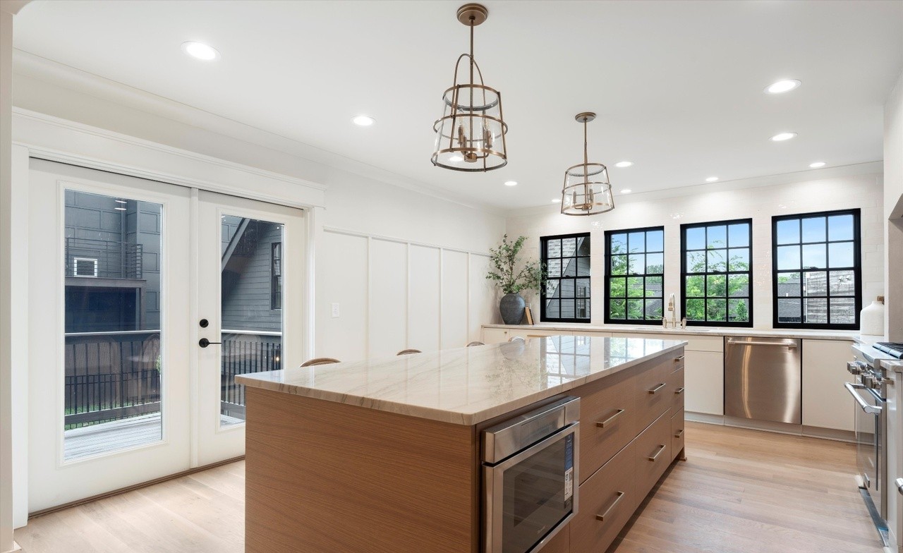 A sophisticated transitional kitchen featuring a striking two-tone design with warm wood cabinetry on the waterfall island and crisp white perimeter cabinets, anchored by a beautiful marble countertop. The space is flooded with natural light from extensive black-framed windows and French doors, complemented by elegant brass pendant lighting and refined brass hardware throughout, creating a warm yet contemporary aesthetic.