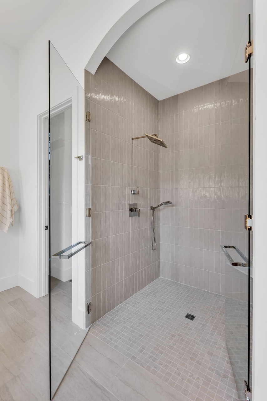 A sophisticated walk-in shower enclosure featuring large-format neutral tiles, dual showerheads with brass hardware, and integrated niches, anchored by clean white walls and a vaulted ceiling. The minimalist design emphasizes luxury through material quality and functional elegance rather than ornamentation.
