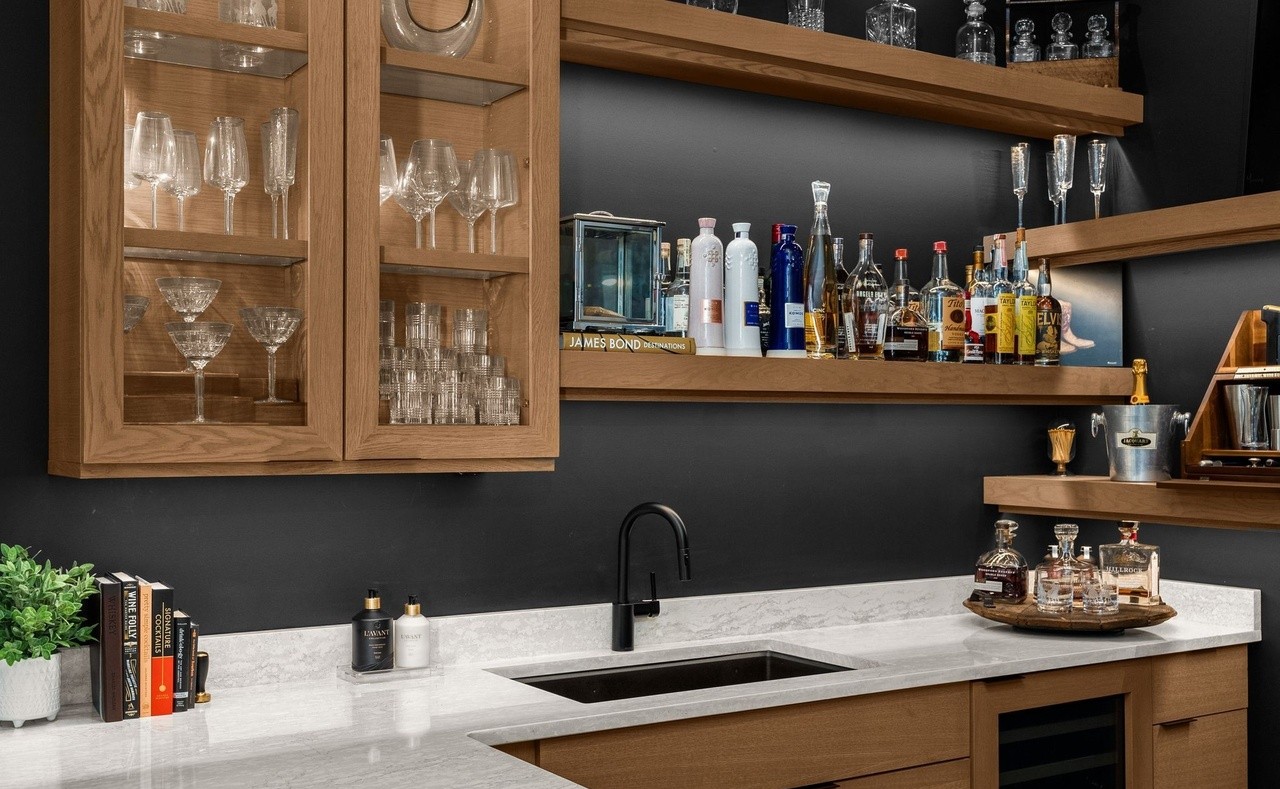 A sophisticated home bar featuring natural wood cabinetry with glass fronts showcasing glassware, paired with a stunning white marble countertop and charcoal accent walls. The space thoughtfully displays an extensive spirit collection on floating shelves with brass hardware and recessed lighting, creating an elevated entertaining destination with warm, refined aesthetics.