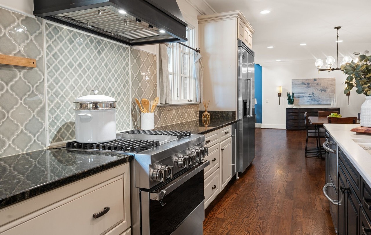 A stunning open-concept luxury kitchen featuring a striking black gas range and coordinating black hood, cream shaker cabinetry, and granite countertops anchored by a geometric patterned wallpaper backsplash. The space seamlessly blends traditional architectural details (crown molding, custom cabinetry) with contemporary hardware and finishes, creating a sophisticated and inviting cooking environment with abundant natural light and thoughtful design layers.