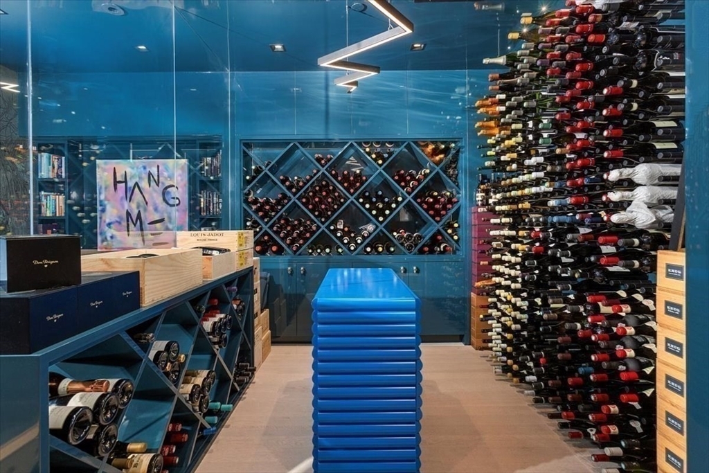 Floor To Ceiling WindowsWine Wall StorageDiamond Wine RackCustom MillworkStatement LightingGlass Front CabinetryOpen ShelvingSculptural Blue Seating