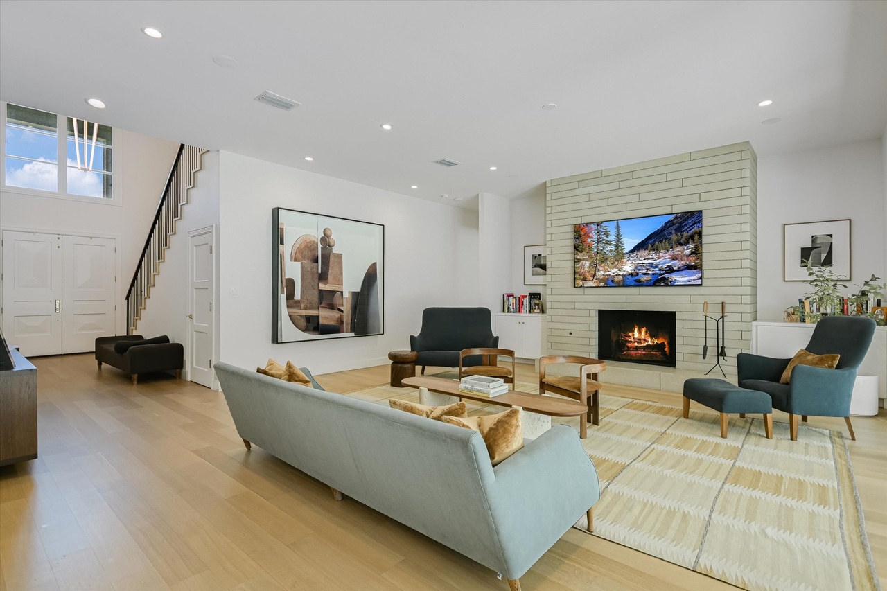 A sophisticated open-concept living room featuring a modern fireplace with cream shiplap surround, warm hardwood floors, and a thoughtfully curated mix of mid-century furniture in natural wood with teal and charcoal upholstery. Floor-to-ceiling windows flood the space with natural light, while understated recessed lighting and a high ceiling enhance the airy, serene atmosphere—a perfect balance of organic warmth and contemporary refinement.