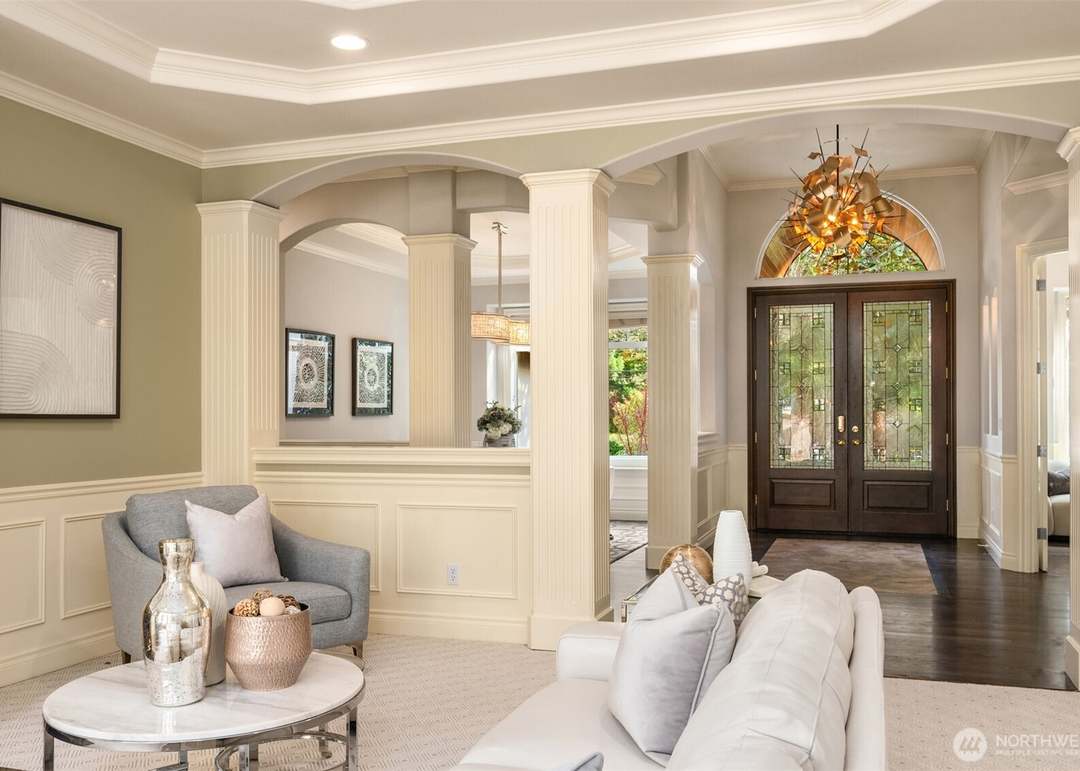 A grand classical foyer featuring coffered ceiling details, ornate cream-and-ivory wainscoting, and custom architectural millwork that seamlessly frames multiple arched passages. The space is anchored by elegant dark wood double doors with stained glass transoms, premium hardwood flooring, and layered lighting including a statement golden chandelier, creating an exceptionally refined entry statement with museum-quality craftsmanship and editorial-level design composition.