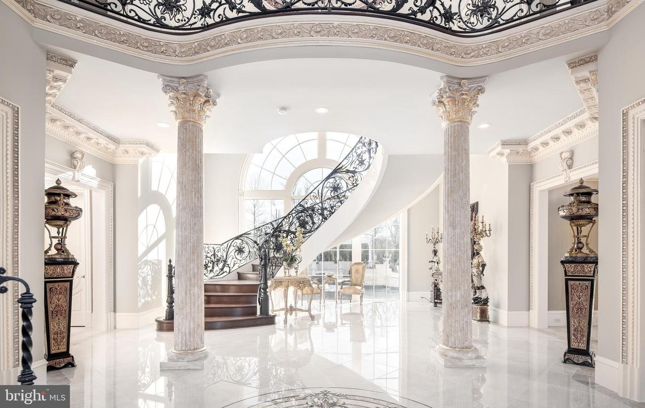 Curved StaircaseOrnate Ironwork RailingFluted ColumnsCorinthian CapitalsCrown MoldingCoffered Ceiling ElementsDomed CeilingDecorative UrnsArched WindowsRecessed LightingHigh CeilingsSymmetrical LayoutGrand FoyerSculptural AccessoriesOrnamental Wall Sconces
