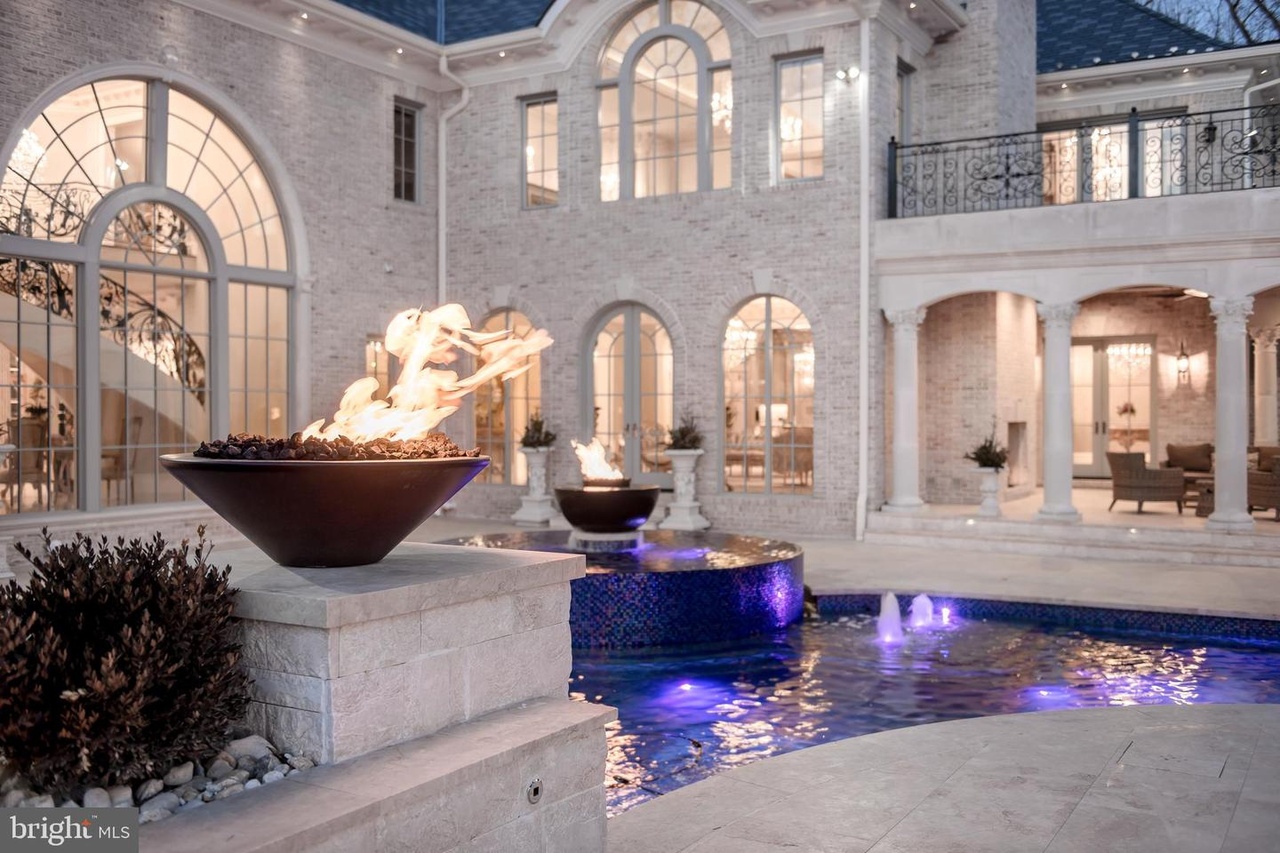 An exceptional resort-style indoor courtyard pool area featuring a white brick colonnaded architecture with arched windows, illuminated by skylights and ambient lighting that creates a dramatic yet serene atmosphere. The space showcases sculptural fire features, mosaic-tiled pool deck with blue-lit water, and seamless indoor-outdoor luxury design with bespoke architectural detailing and professional staging.