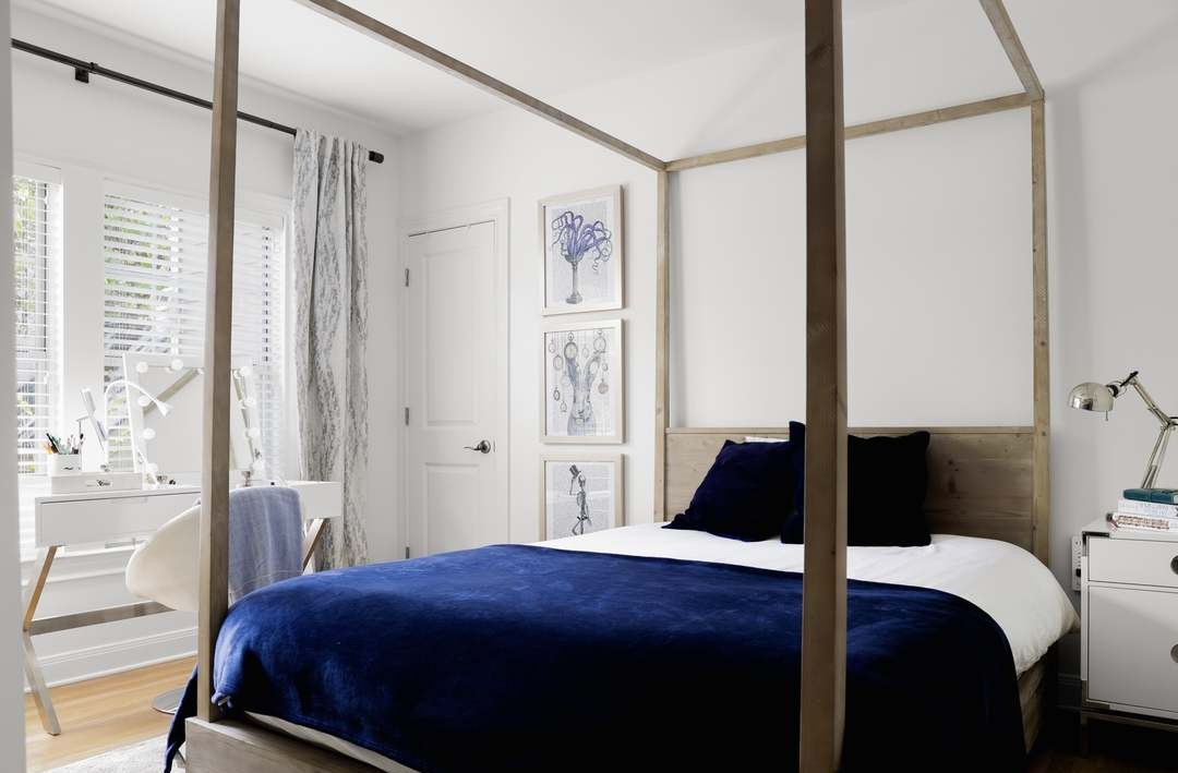 An elegantly appointed primary bedroom featuring a striking natural wood-framed canopy bed dressed in rich navy velvet, anchored by crisp white walls and abundant natural light from plantation shutters. The sophisticated transitional design seamlessly blends traditional architectural elements like crown molding with clean, modern furnishings and a connected en-suite bathroom, creating a serene and luxurious retreat.