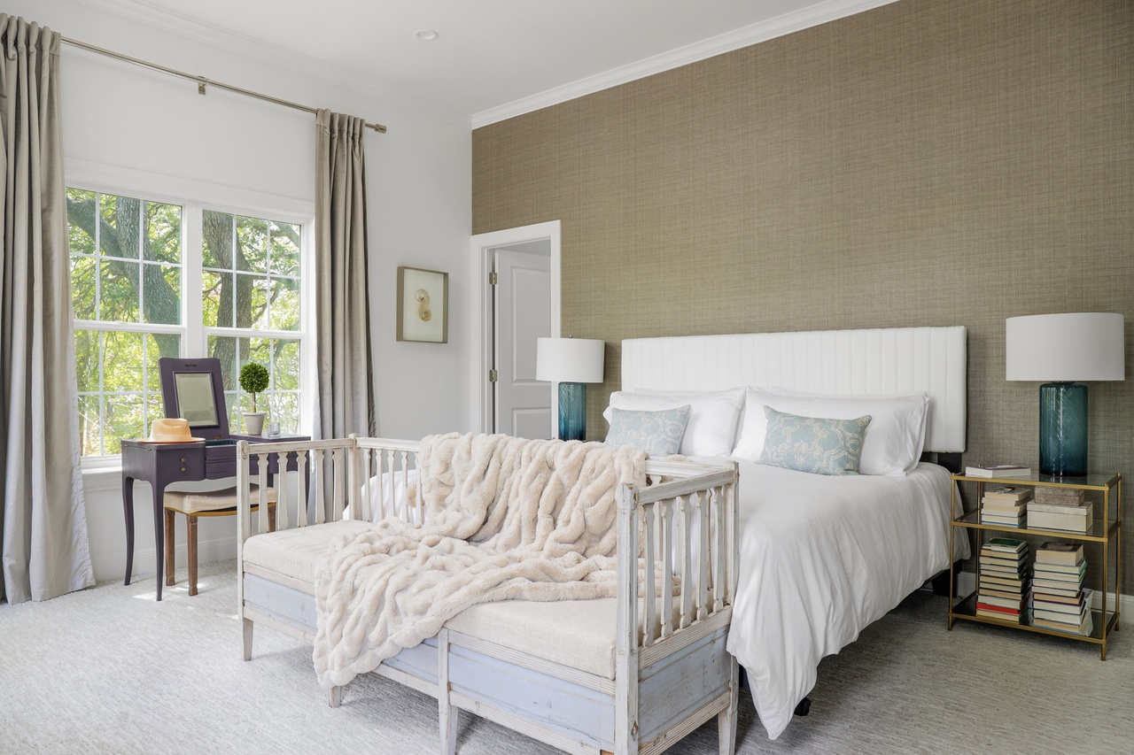 A serene primary bedroom with soft neutral tones and subtle blue-green accents, featuring a textured wallpapered accent wall, abundant natural light from tall windows, and elegant traditional molding paired with contemporary furnishings. The space combines layered luxury with a calming aesthetic, enhanced by brass-finished lighting and a wooden crib that adds residential warmth to this sophisticated master suite.