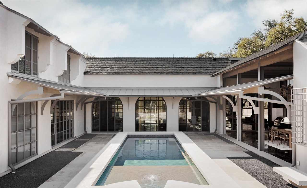 An exceptionally sophisticated modern pool courtyard featuring a lap pool framed by gleaming white residences and a sculptural pergola structure with curved wood beams and black steel detailing. The minimalist aesthetic is elevated by high-end stone paving, expansive glass walls, and seamless indoor-outdoor integration that exemplifies contemporary luxury residential design.