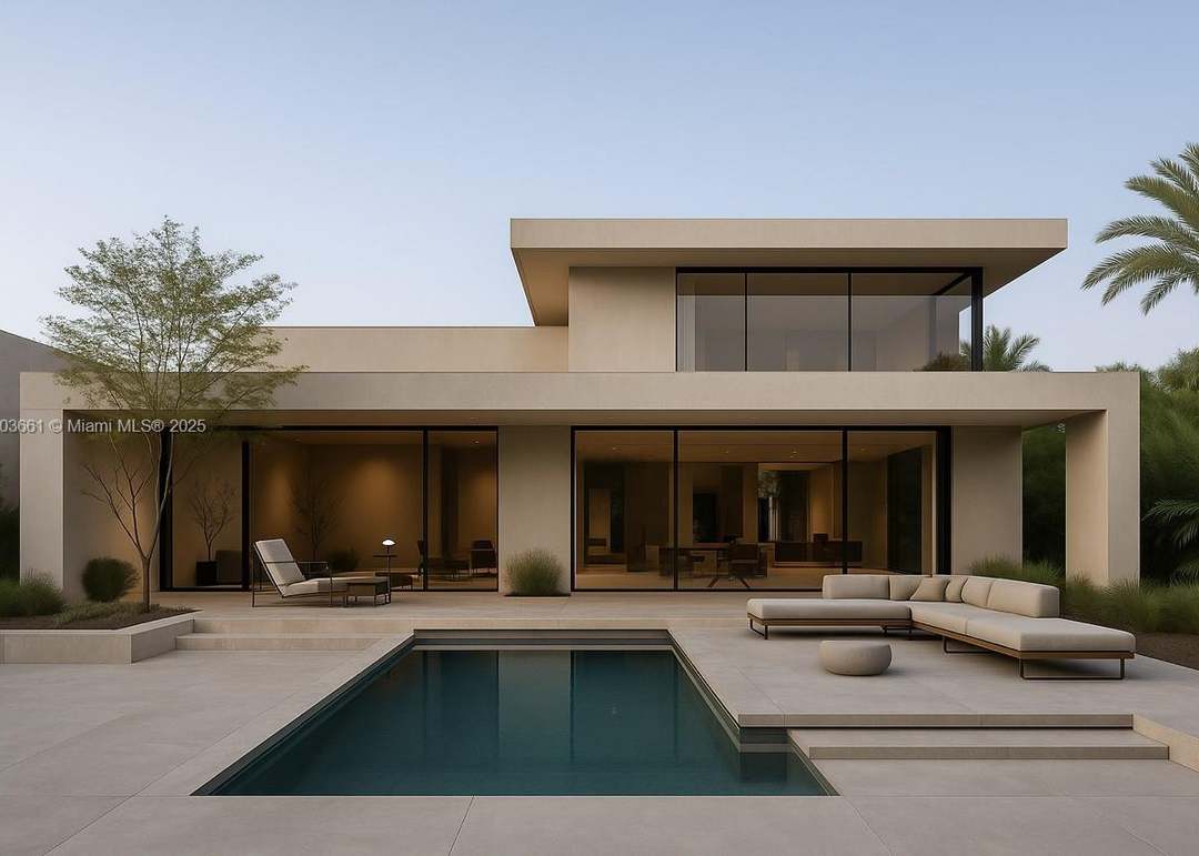 A striking contemporary pool area featuring minimalist modernist architecture with seamless indoor-outdoor integration, anchored by a rectangular deep-teal pool set into warm stone pavers. The serene composition balances expansive glass walls, neutral stucco facades, curated modern lounge furniture in cream tones, and mature landscaping to create an editorial-quality luxury outdoor living space.