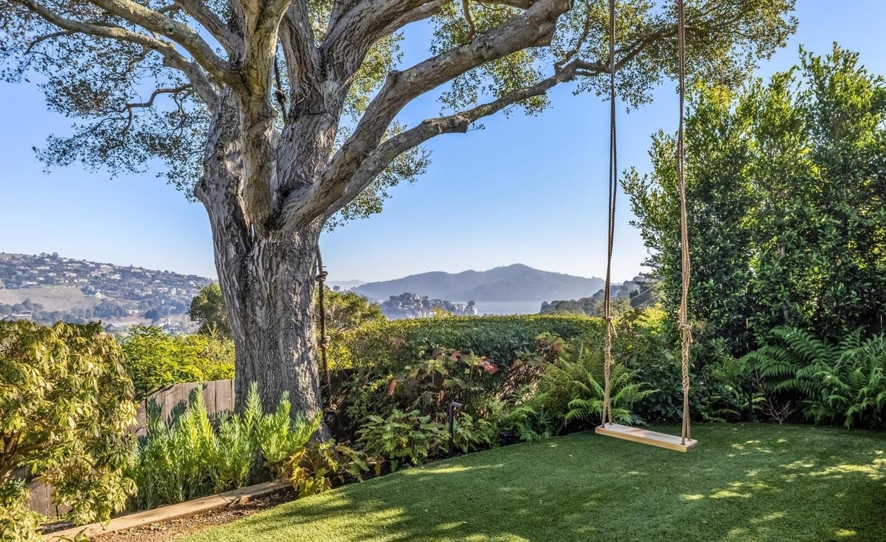A breathtaking hilltop patio showcasing a mature specimen tree with rope swing, anchoring a manicured lawn with panoramic views of rolling hills and distant mountains. The space epitomizes luxury outdoor living through restraint—combining natural materials, abundant sunlight, and carefully curated landscape design to create an effortlessly sophisticated retreat.