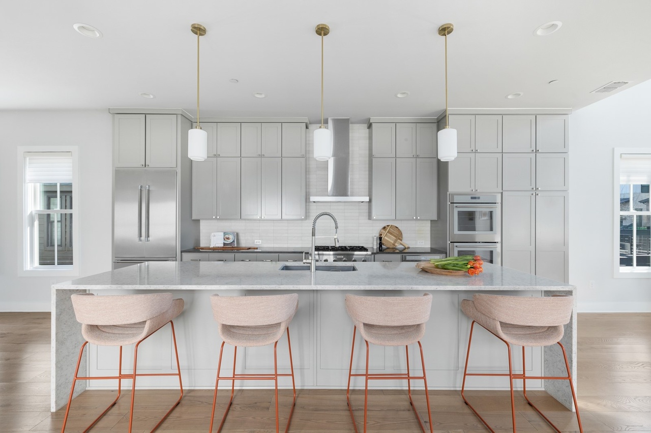 A sophisticated transitional kitchen featuring a light gray flat-panel cabinetry with brass hardware, white subway tile backsplash, and a striking waterfall-edge quartz island. The space balances cool-toned minimalism with warmth through natural wood flooring, blush upholstered stools with copper frames, and carefully curated lighting that creates an elevated yet livable luxury aesthetic.