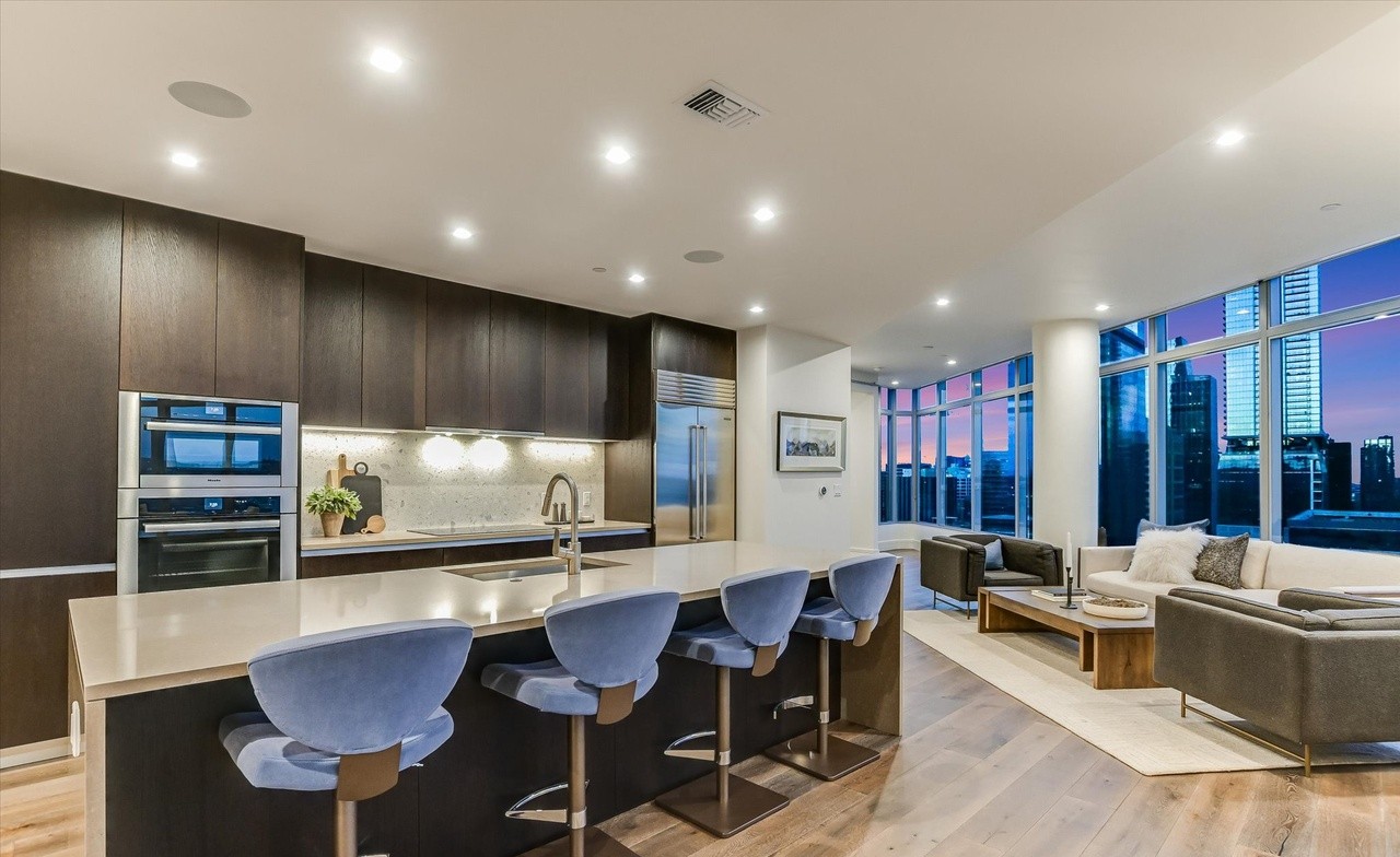 A stunning contemporary open-concept kitchen and living room featuring dark stained cabinetry, white quartz countertops with waterfall island detail, and floor-to-ceiling windows offering panoramic city skyline views. The space seamlessly blends minimalist design with organic warmth through brass hardware, natural wood tones, and a sophisticated palette of whites, grays, and blues accented by elegant blue mid-century dining chairs.