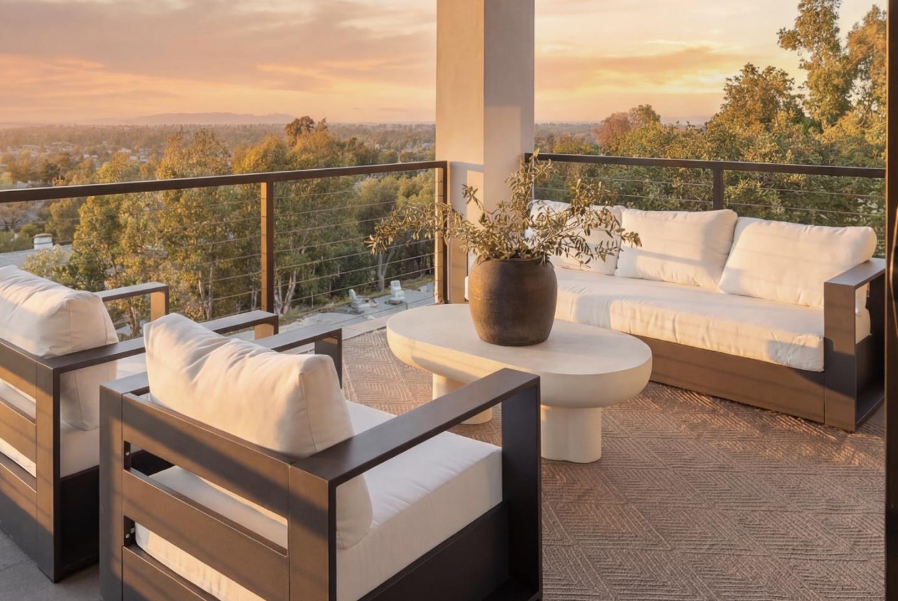 A stunning elevated patio showcasing panoramic autumn forest views with minimalist modern furniture in soft neutrals and a sculptural concrete-and-wood side table. The design balances sophisticated urban aesthetics with organic warmth through natural materials and a serene color palette.