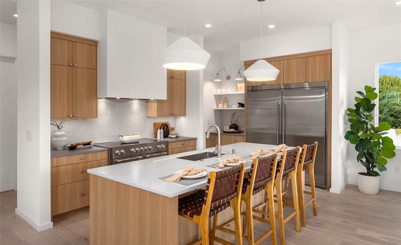 A sophisticated open-concept kitchen featuring warm light wood cabinetry with crisp white walls and a luminous quartz waterfall island, anchored by sculptural pendant lighting and brass hardware. The design balances natural materials with contemporary fixtures, creating an airy yet warm luxury space ideal for modern entertaining and daily living.