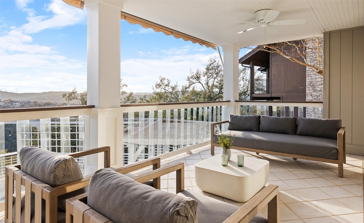 An expansive covered patio with commanding mountain views, featuring warm natural wood furniture paired with neutral textiles and cream accents. The space combines organic modern warmth with transitional architectural details, including a wood-plank ceiling, white painted beams, and floor-to-ceiling glass railings that maximize sightlines while maintaining an elegant, sophisticated outdoor living environment.