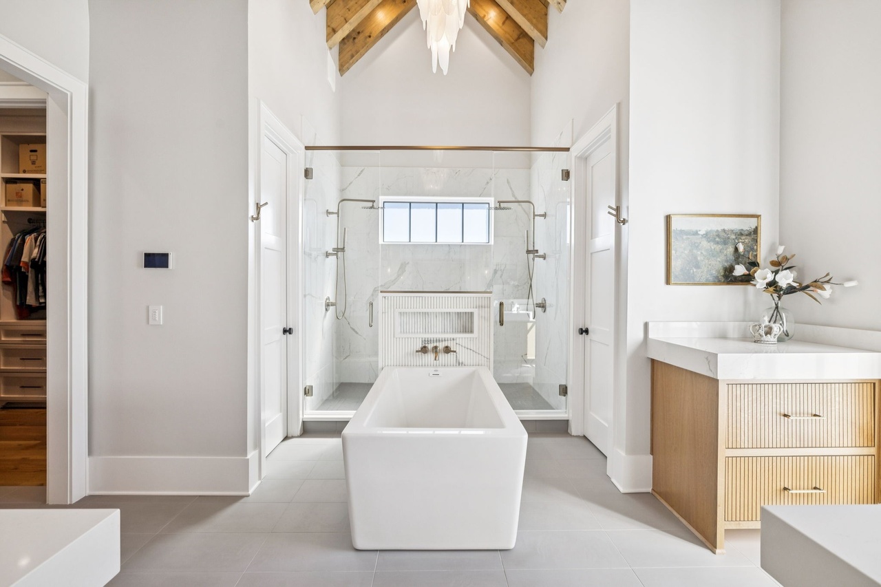 Freestanding TubWalk In ShowerFrameless Glass EnclosureFloating VanityVaulted CeilingExposed BeamsStatement LightingSkylightsHigh CeilingsCrown MoldingDouble Vanity Areas