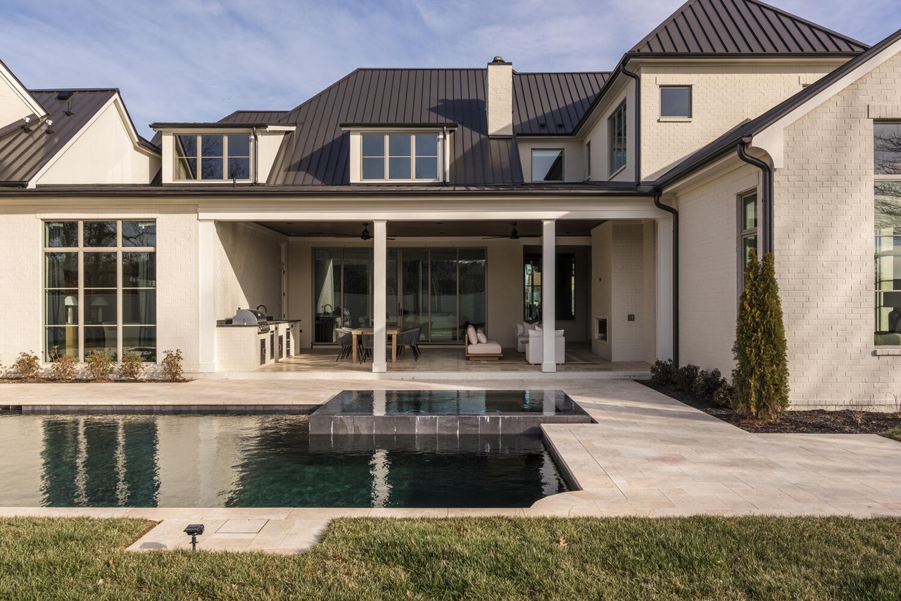 A sophisticated modern estate pool and patio area seamlessly integrating covered outdoor living with a heated pool and spa, framed by striking white brick architecture with dramatic metal roofing and floor-to-ceiling glass walls that dissolve the boundary between interior and exterior. The refined neutral palette, high-end stone paving, and restrained furnishing create an editorial-quality outdoor sanctuary with exceptional attention to detail and proportion.