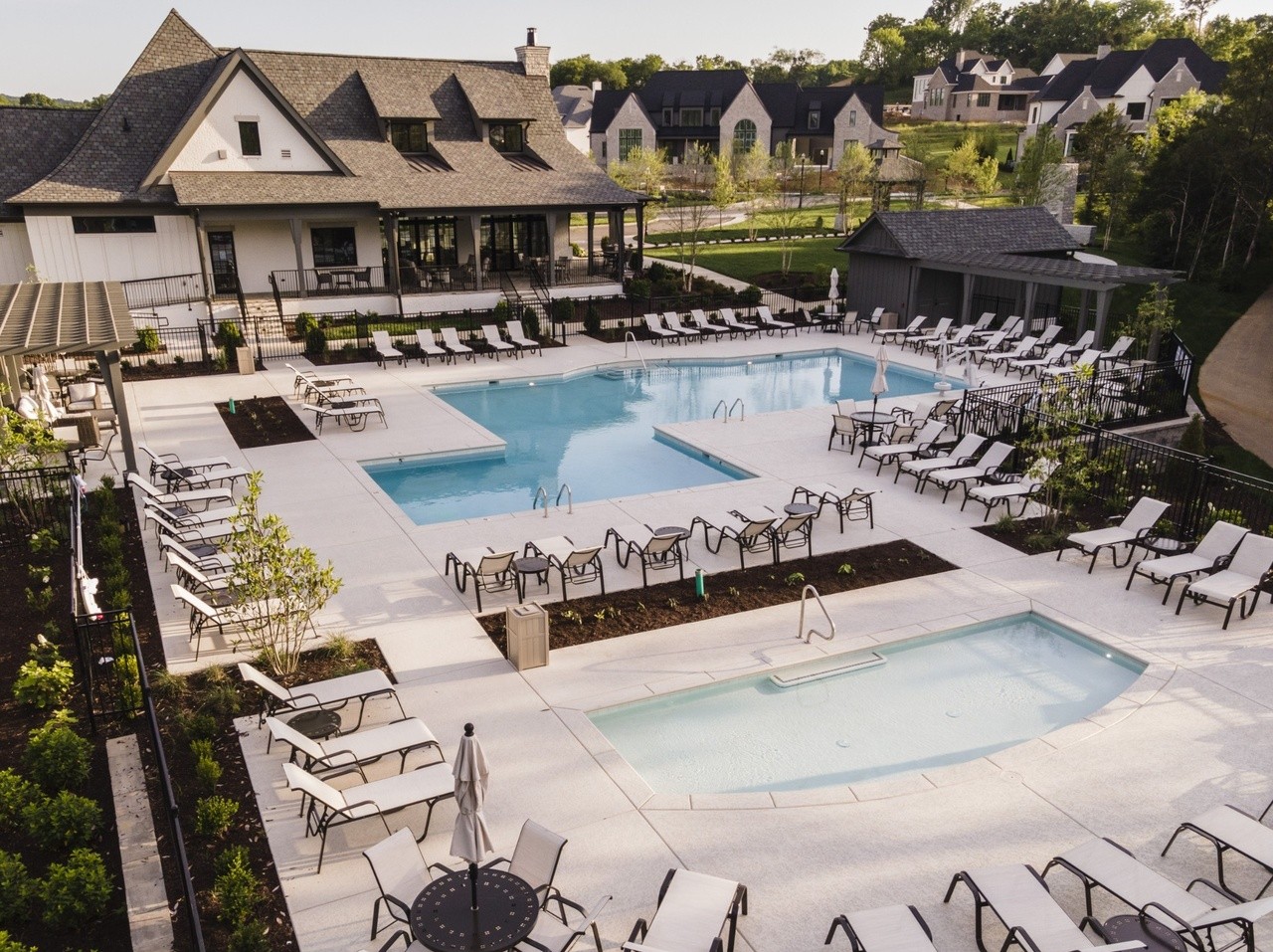 A resort-style pool complex featuring dual swimming pools with integrated hot tub, expansive concrete decking, and meticulously arranged lounge seating surrounding the water features. The design showcases sophisticated outdoor living with a modern aesthetic, complemented by elegant estate architecture and manicured landscaping that creates a five-star resort atmosphere.