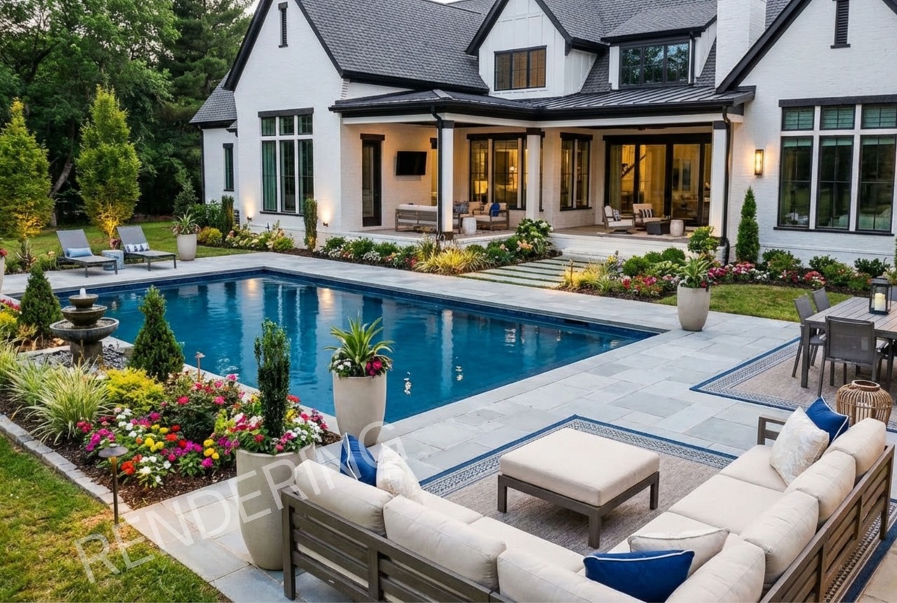 An exceptionally curated resort-style pool area featuring a geometric saltwater pool with integrated stone decking, professional landscape design with layered plantings, and sophisticated outdoor seating arranged around a central entertaining zone. The space seamlessly blends contemporary aesthetics with organic warmth through natural materials, neutral tones accented with navy and jewel-tone florals, and elegant furnishings that create multiple functional zones for relaxation and entertaining.