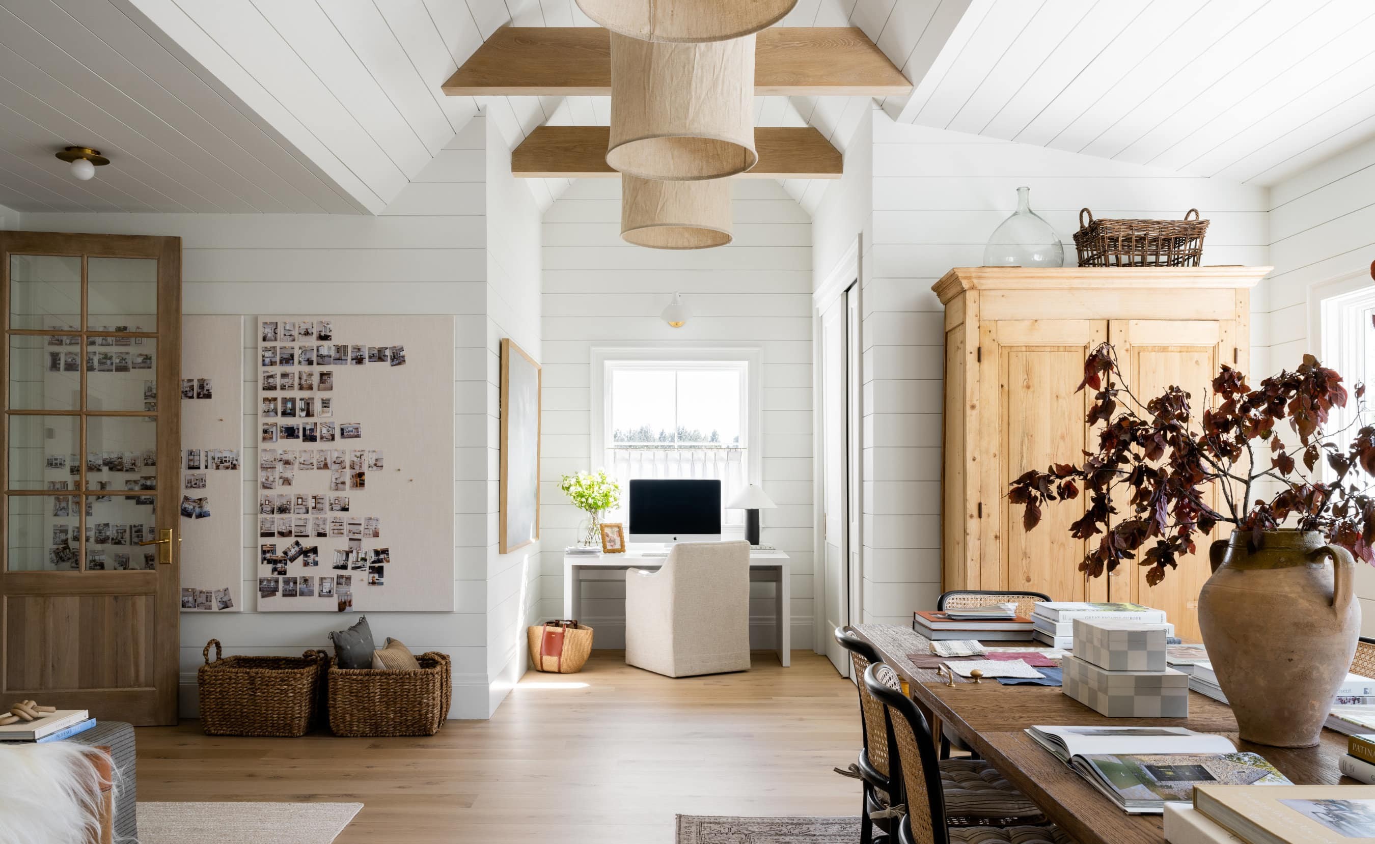 This airy home office features soaring vaulted ceilings with white shiplap walls and exposed structural beams accented by sculptural wood pendant lighting. The space combines organic modern sensibility with farmhouse charm through natural wood cabinetry, wicker storage baskets, and a curated desk display with dried botanicals and books.