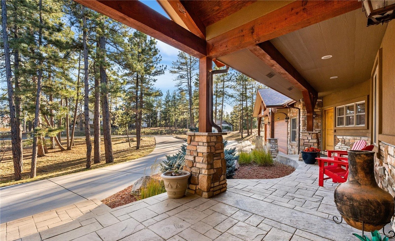 A stunning mountain-modern covered patio seamlessly integrates indoor and outdoor living with exposed timber beams, stone column supports, and perfectly laid stone pavers overlooking a dense evergreen forest. The space balances architectural drama with warm, welcoming furnishings—red Adirondack chairs and terra cotta planters add casual luxury against the soaring timber structure and ambient recessed lighting.